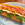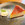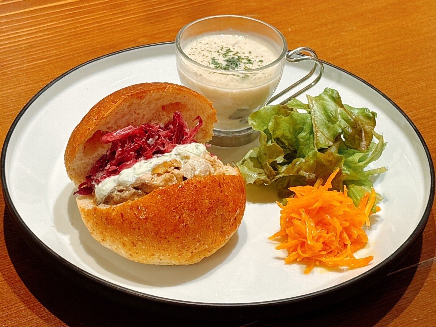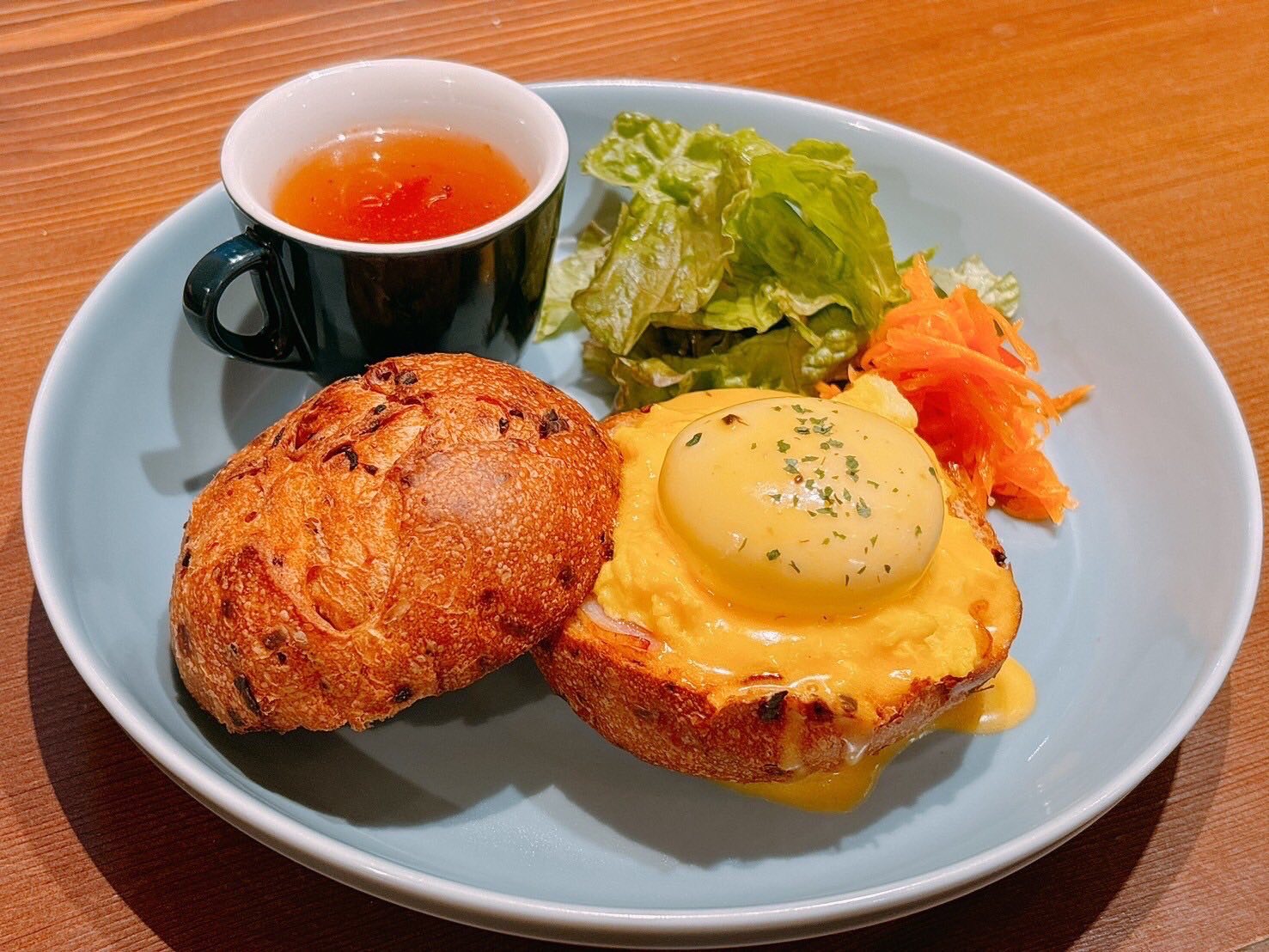 オニオンパンに卵黄バター・レモンソースとハムをはさんでたまごのせ。ミニスープと野菜そえ