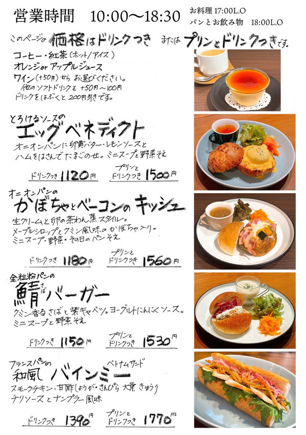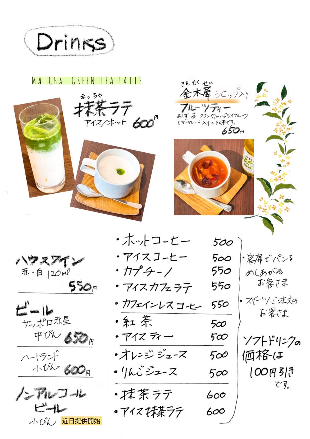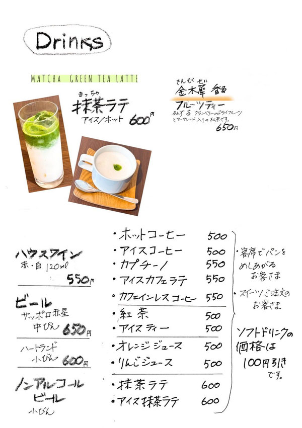 ※ドリンクはコーヒー、紅茶(ホットorアイス)、オレンジジュース、アップルジュース、ワイン(+50円)よりお選びいただけます。その他のドリンクも+50円〜100円 ドリンクをはぶくと200円引きです。