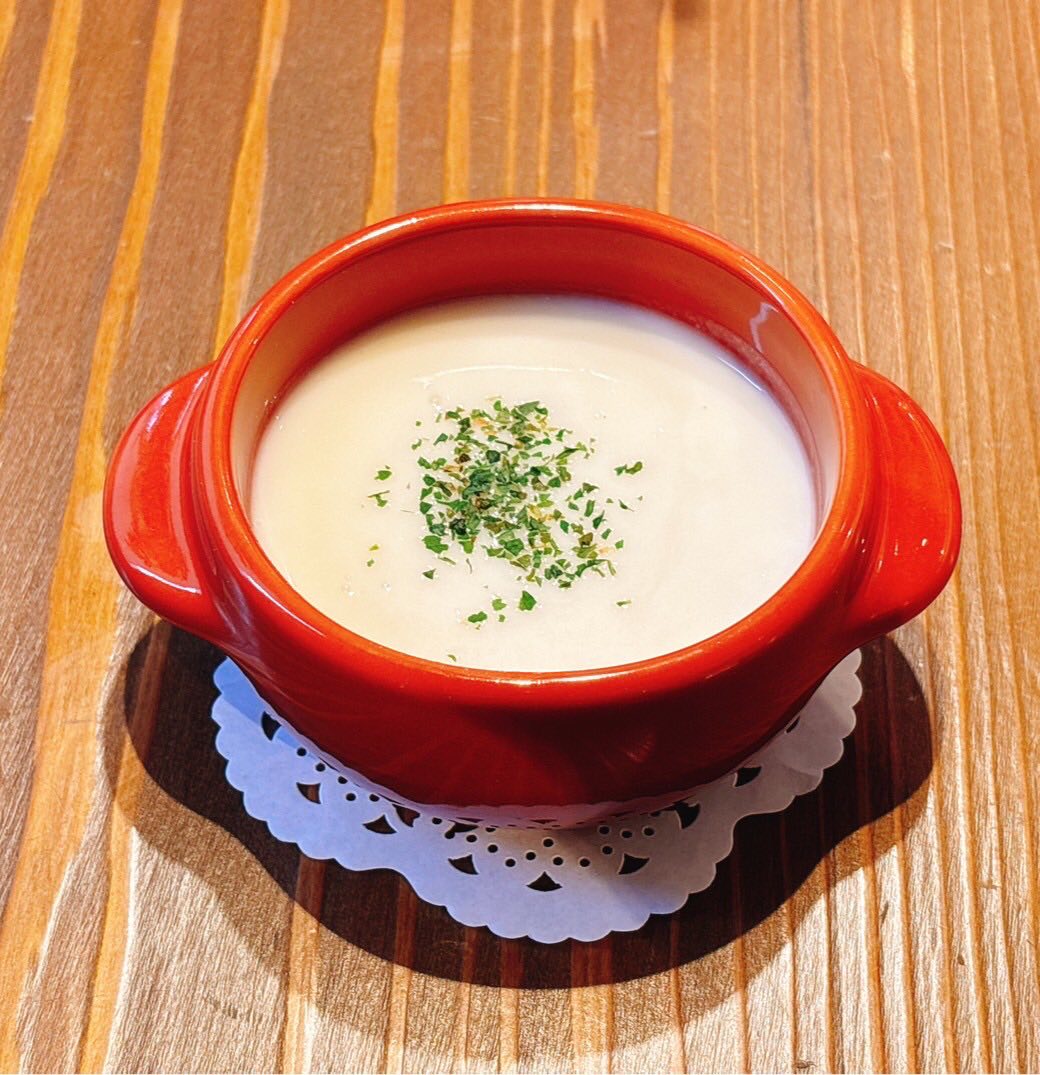 生クリームと卵の茶わん蒸しスタイル。メープルシロップとクミン風味のかぼちゃ入り。ミニスープ・野菜・その日のパンそえ。